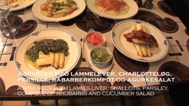 Asparges med lammelever, charlotteløg, persille, rabarberkompot og agurkesalat