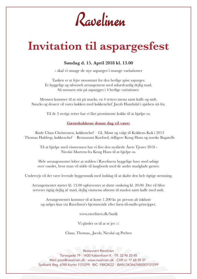 Tanken er at fejre sæsonstart for den herlige spise asparges. Et hyggeligt og uformelt arrangement med udsædvanlig dejlig mad. Så menuen står på aspargges i 3 herlige variationer. Menuen kommer til at stå på snacks, en 4 retters menu samt kaffe og sødt. Snacks og dessert vil vores køkken med køkkenchef Jacob Hundsdal i spidsen stå for. Til de 3 øvrige retter får vi hjælp af prominente kokke - den ene er naturligvis Den Røde